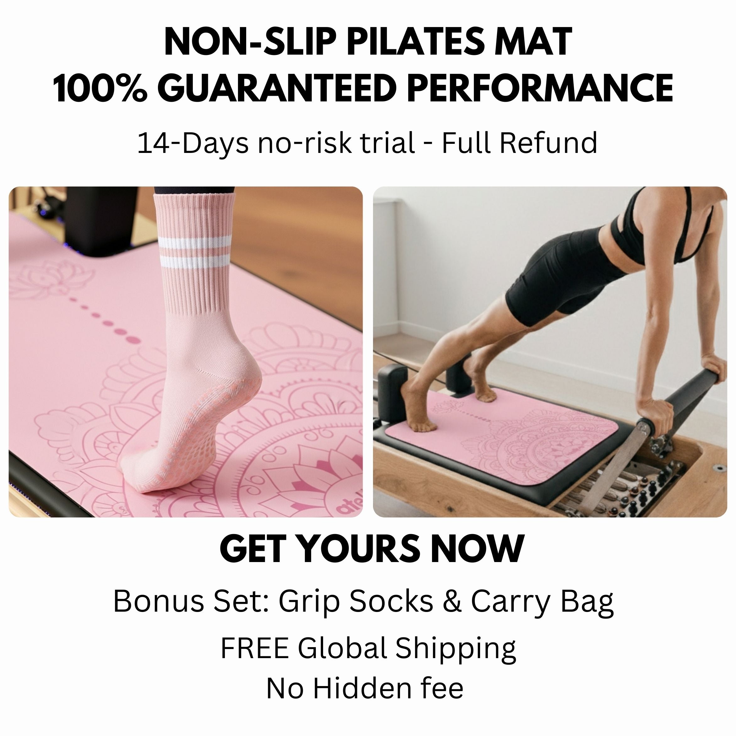 The mat is made of of a really nice material that is just the right thickness and grips perfectly to a pilates machine. After use it folds up nicely for easy storage into the included bag. I've already used this about 15 times and there's no visible signs of wear and it has kept clean the whole time. The socks are comfortable, with the grips on the soles being just the right thickness.
